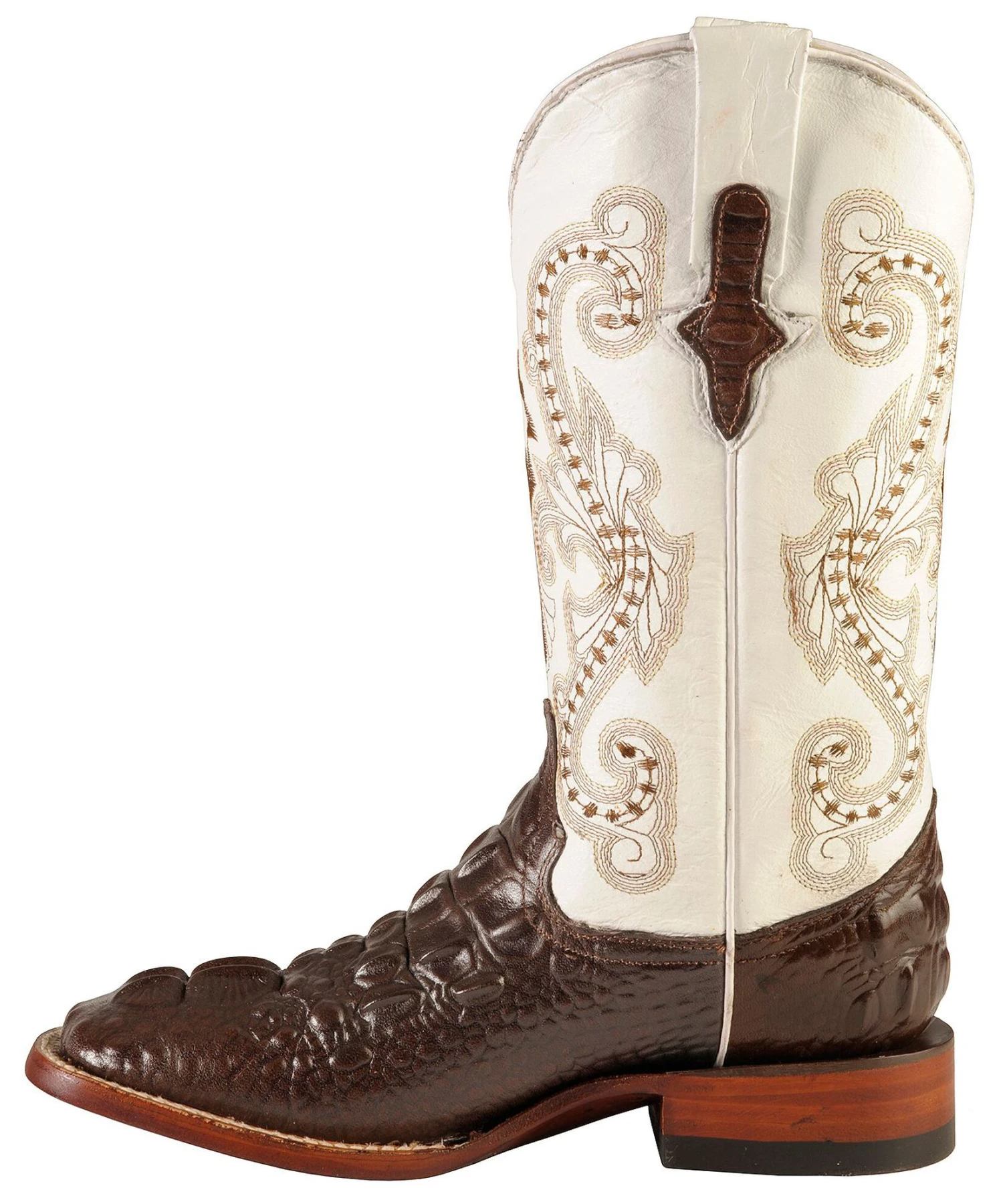 - Brown embroidery decorates bright white leather shaft