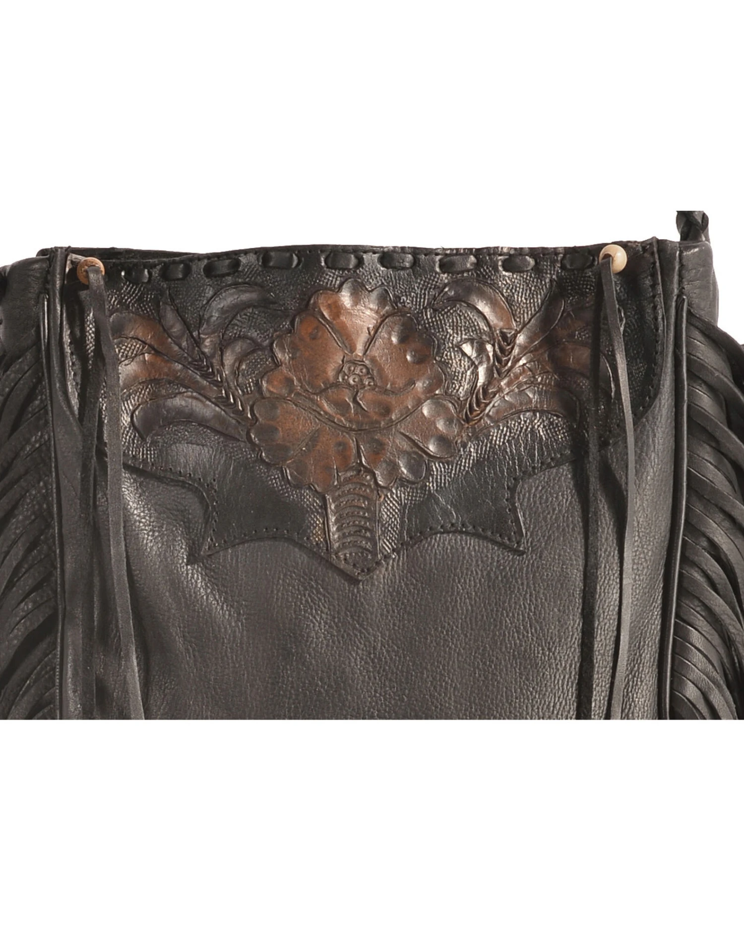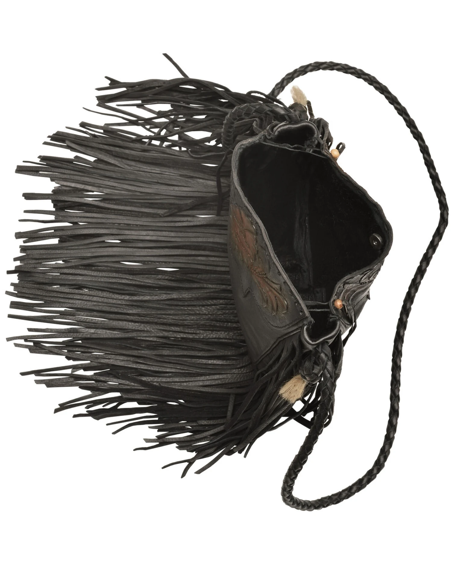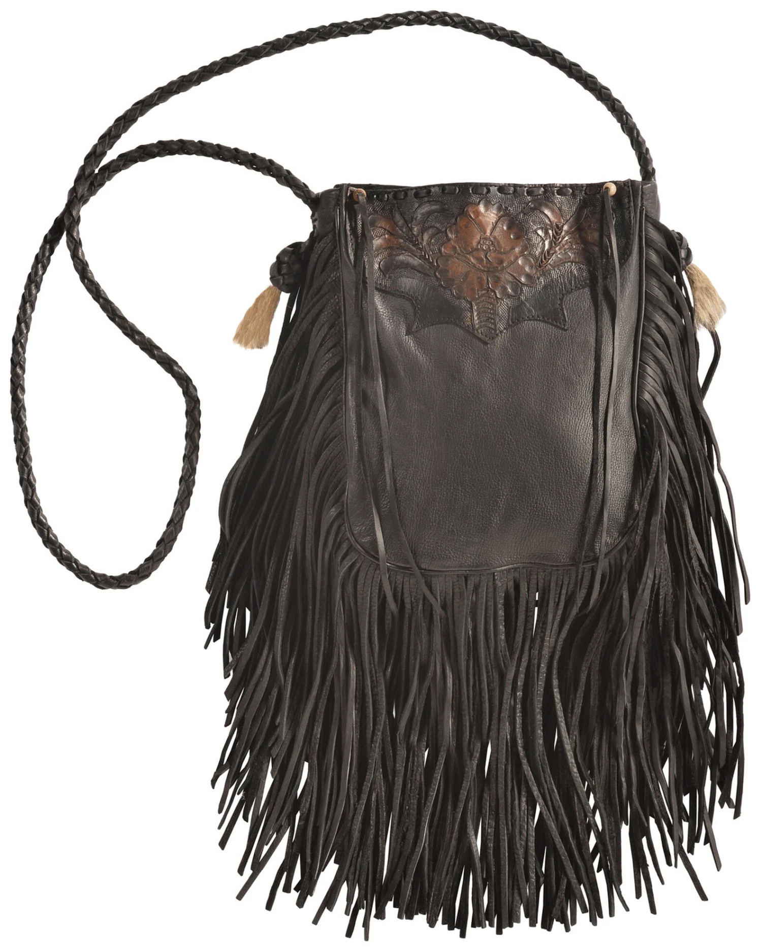 - Front flap with floral design and hair tassels