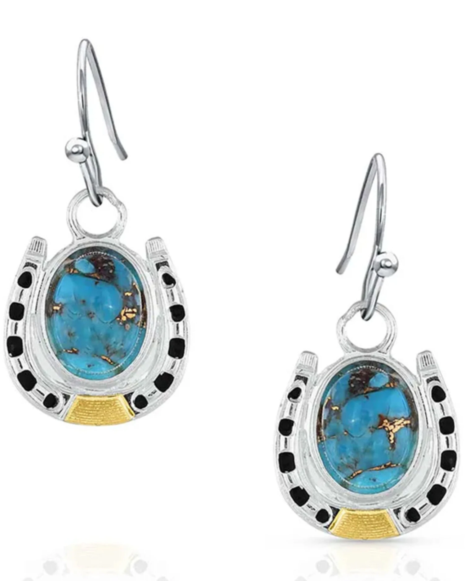- Gold and silver horseshoes wrap around turquoise stone