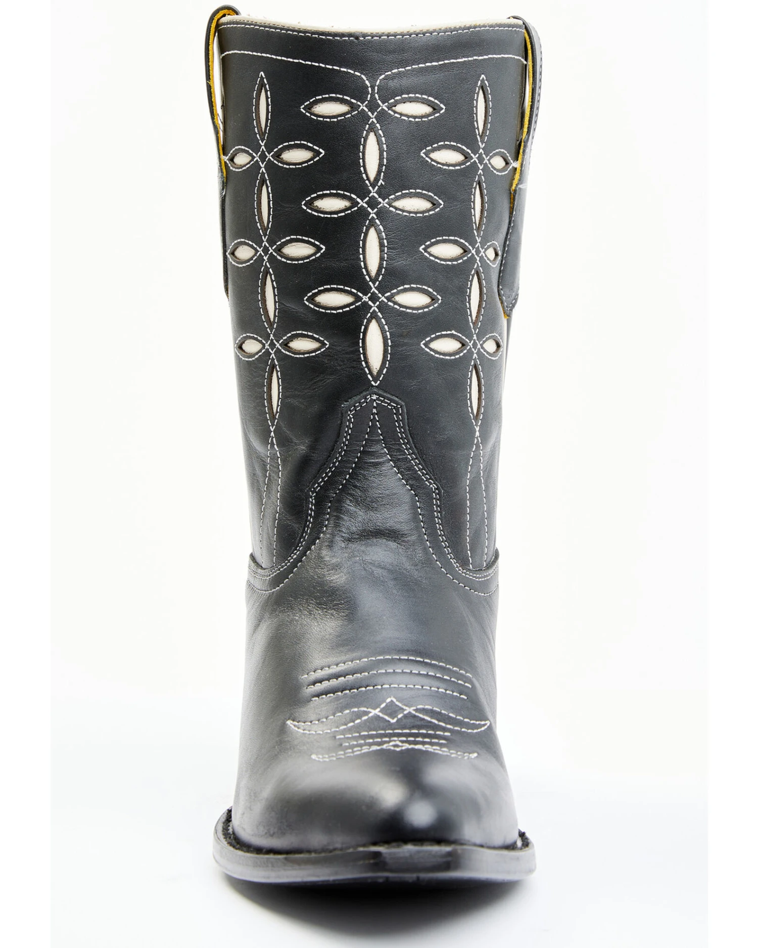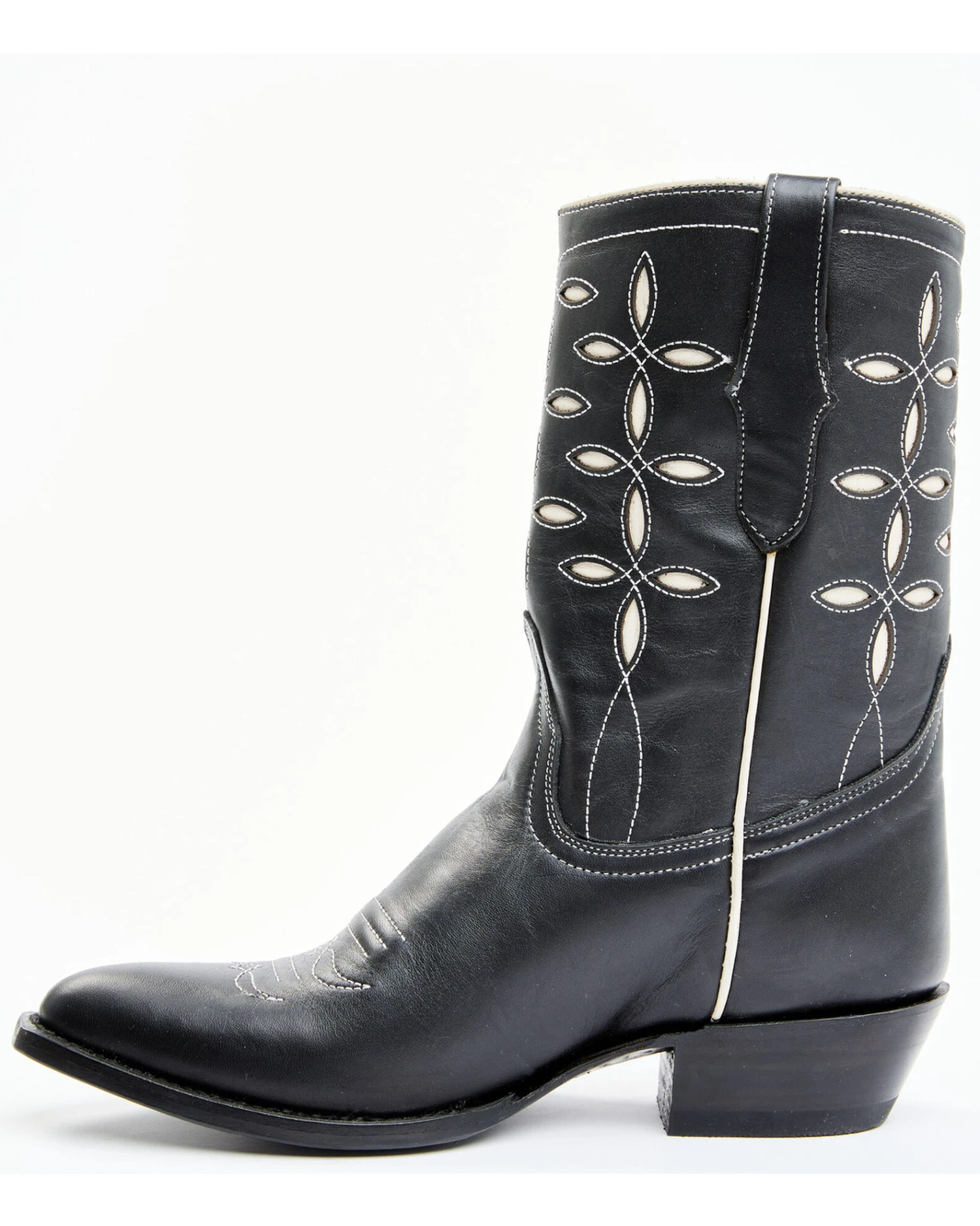 - Contrast white inlay and stitch detailing