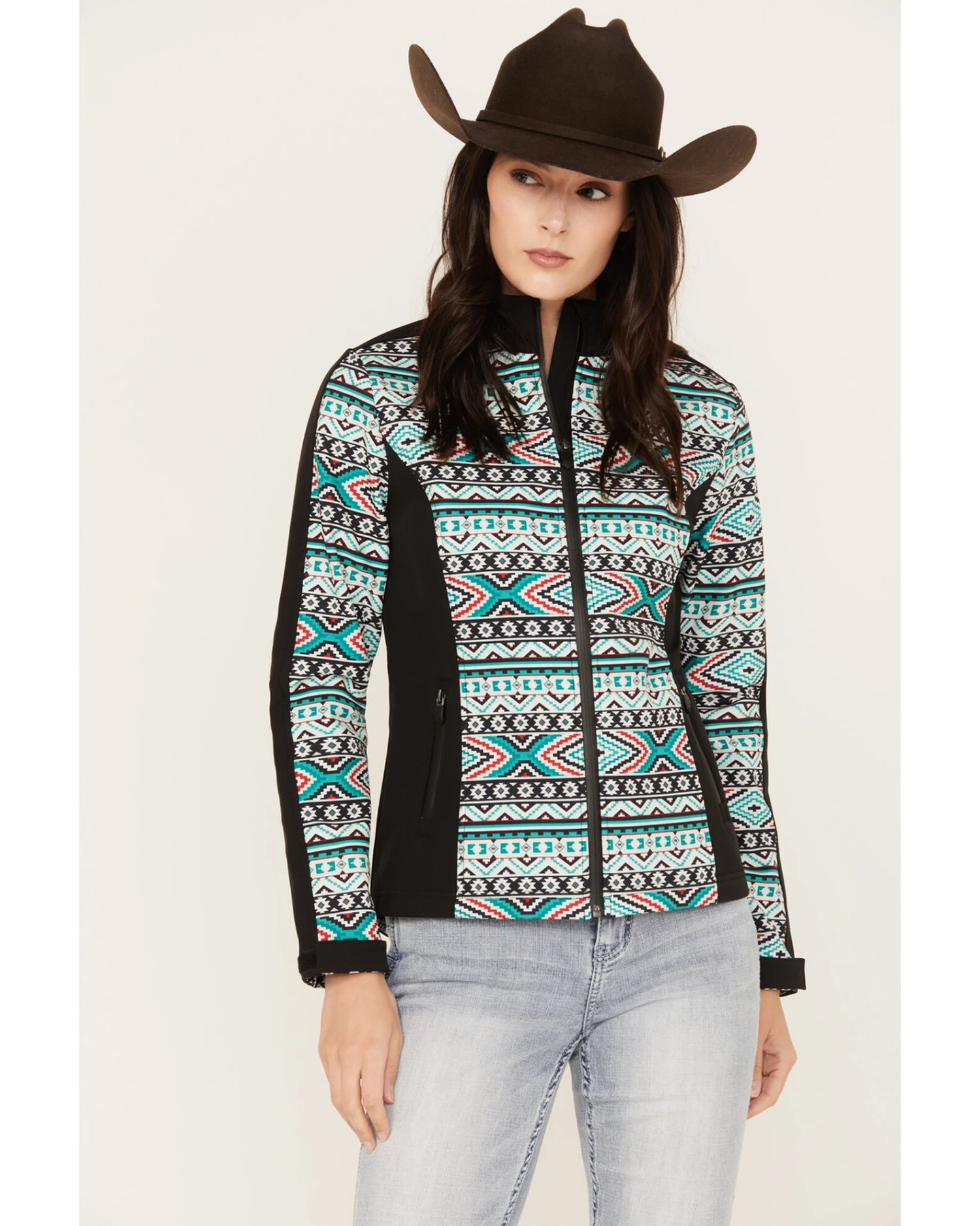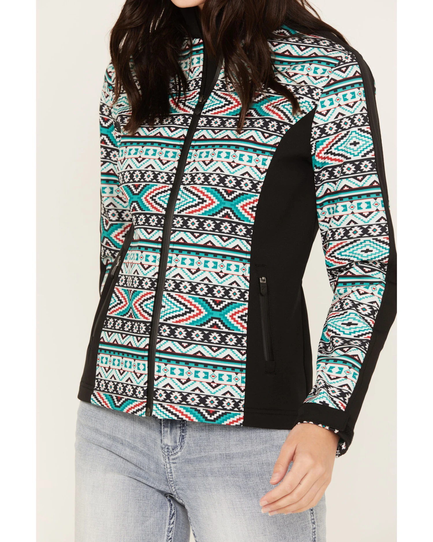 - Multicolored Southwestern print with black details on sides and sleeves