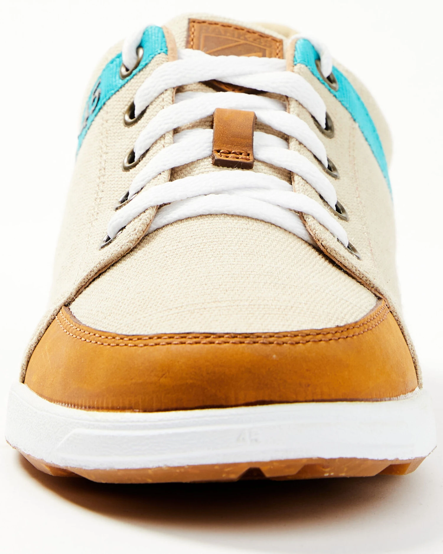- Brown leather accent on toe and heel