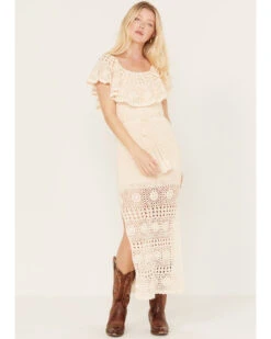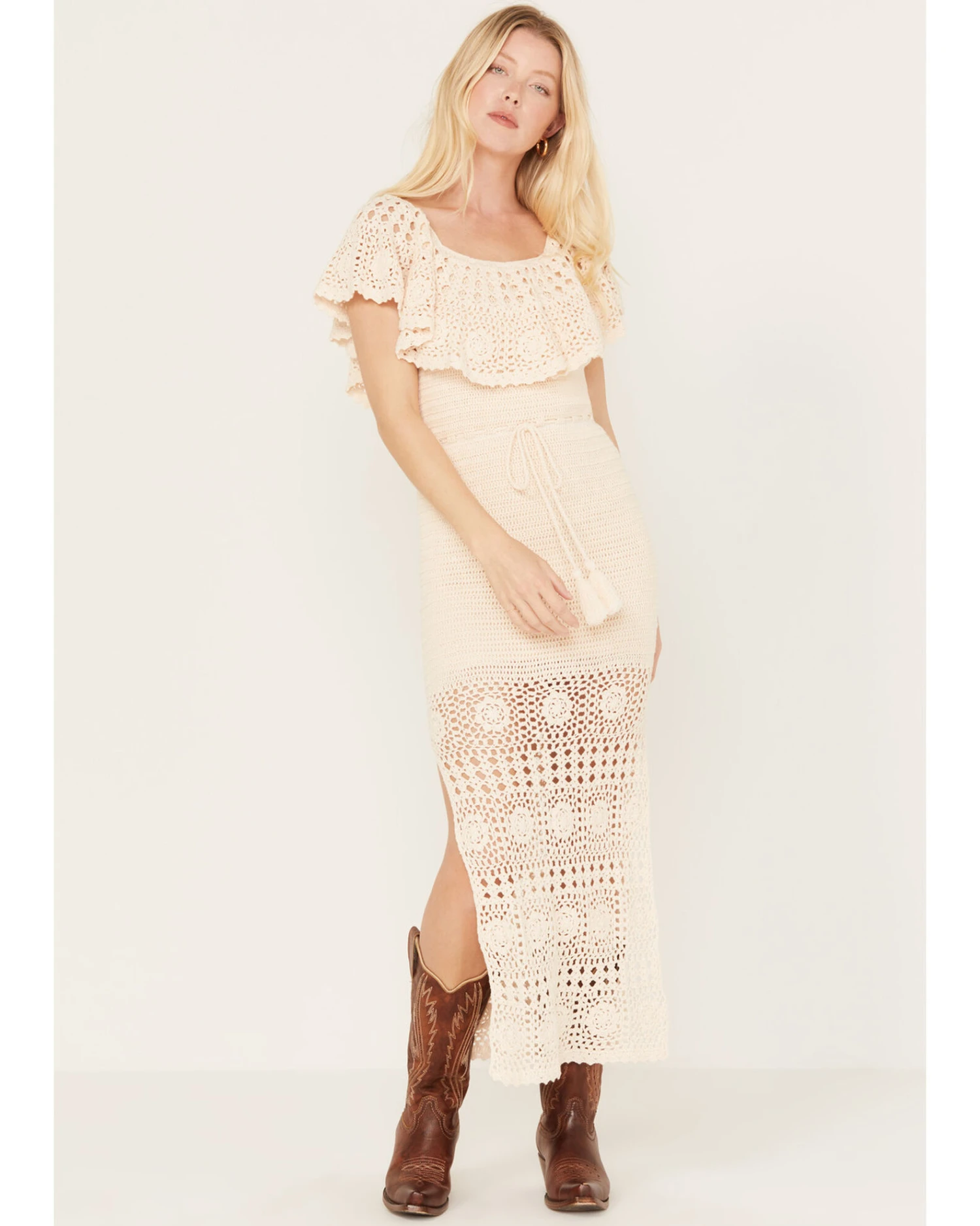 - Allover cream crochet design with cream slip underneath