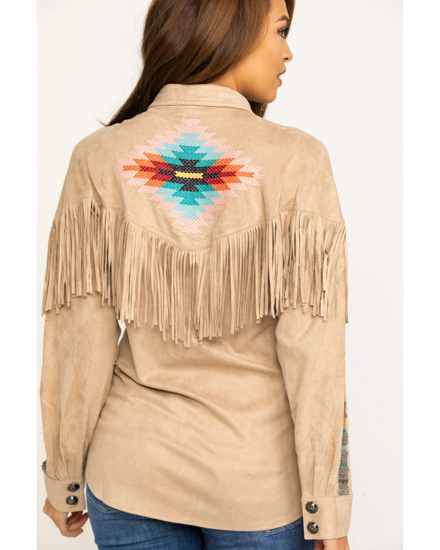 - Fringe and southwestern beading along yokes