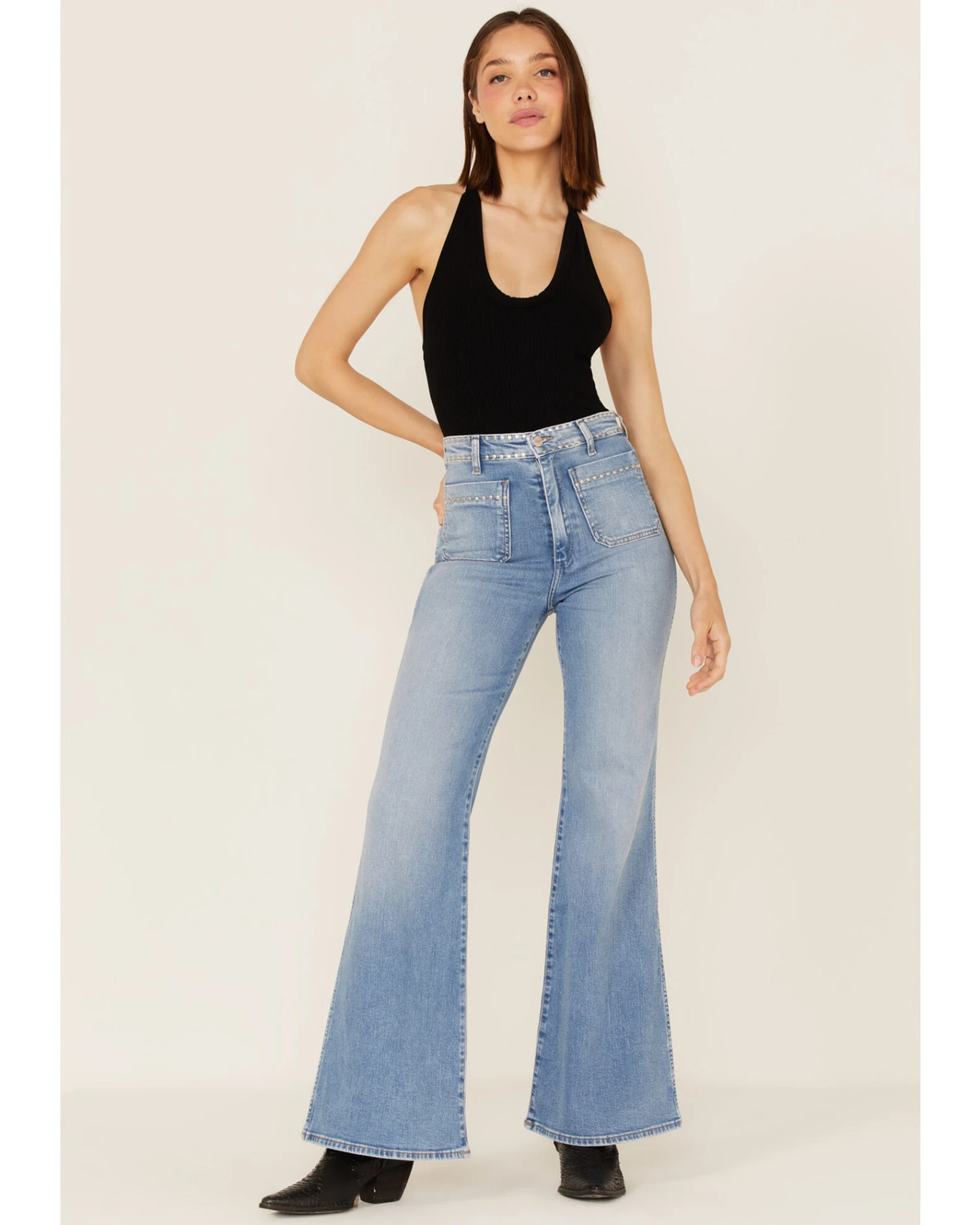 - Round silver-tone studded details on waistband and front pockets